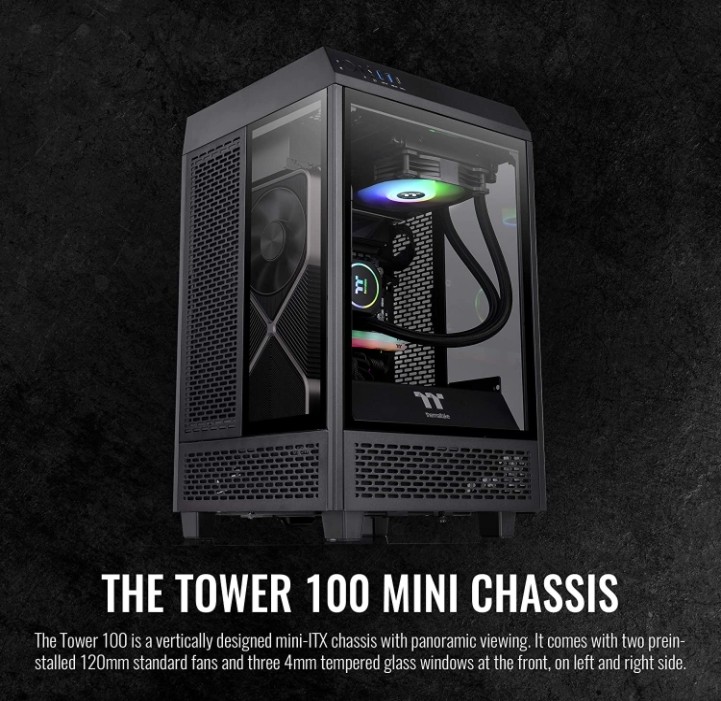 The Tower 100 Mini Chassis Designed to expand the legacy of The Tower 900 E-ATX Super Tower Chassis, The Tower 100 Mini Chassis is the newest member of The Tower Series. It features three 4mm tempered glass windows for a stunning view and two preinstalled 120mm standard fans on top and at the rear for exhaust. It is a much smaller version of The Tower 900 with dimensions of 462.8mm (Height), 266mm (Width), 266mm (Depth). Though it may not be the smallest Mini-ITX chassis on the market, it is a highly capable one that can fit high-end components like the RTX 30 Series Graphics Cards. The Tower 100 Mini Chassis is designed to target users who have a limited space at their workplace or at home, or those who simply do not want their PC to take too much space. No matter if you are a regular users, gamers, or content creators, etc. you will find it ideal and can place it almost anywhere in your room.